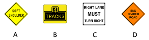 188. 下面的哪一个标志表示如果你继续保持在最右侧的车道上行驶,那么在前方必须右转弯。